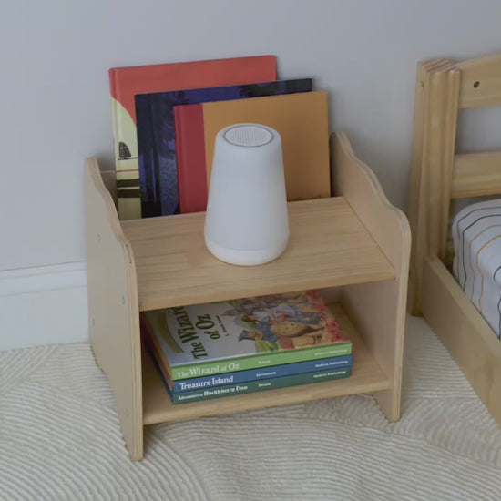 A Montessori style nightstand designed specifically for floor beds, giving toddlers and young children easy access to their bedtime essentials. This low kids nightstand features two sturdy shelves and a front-facing book pocket, creating a simple and organized space for books, a water bottle, a lamp, or a favorite plushie.
