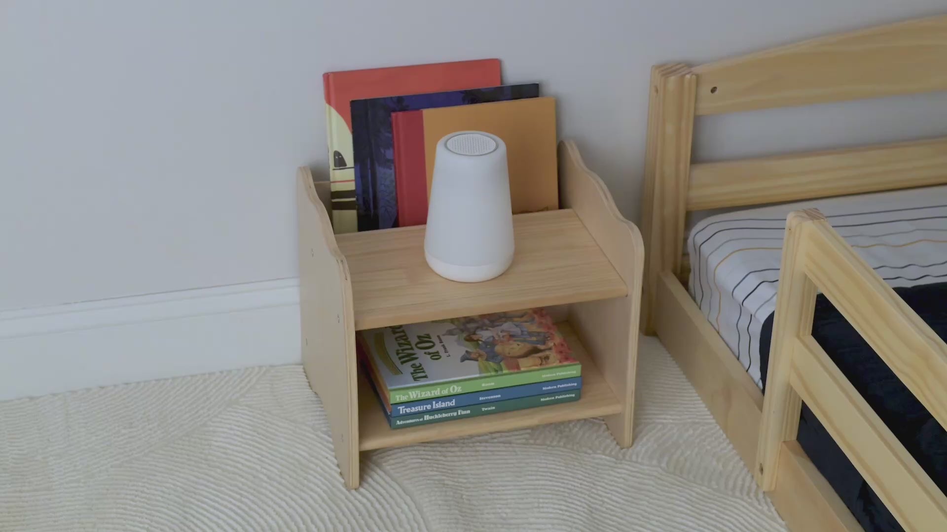 Perfect for children ages 2+ who sleep in a floor bed and are learning to manage small routines independently — choosing a book before bed, keeping a favorite toy nearby, or reaching their water without help.