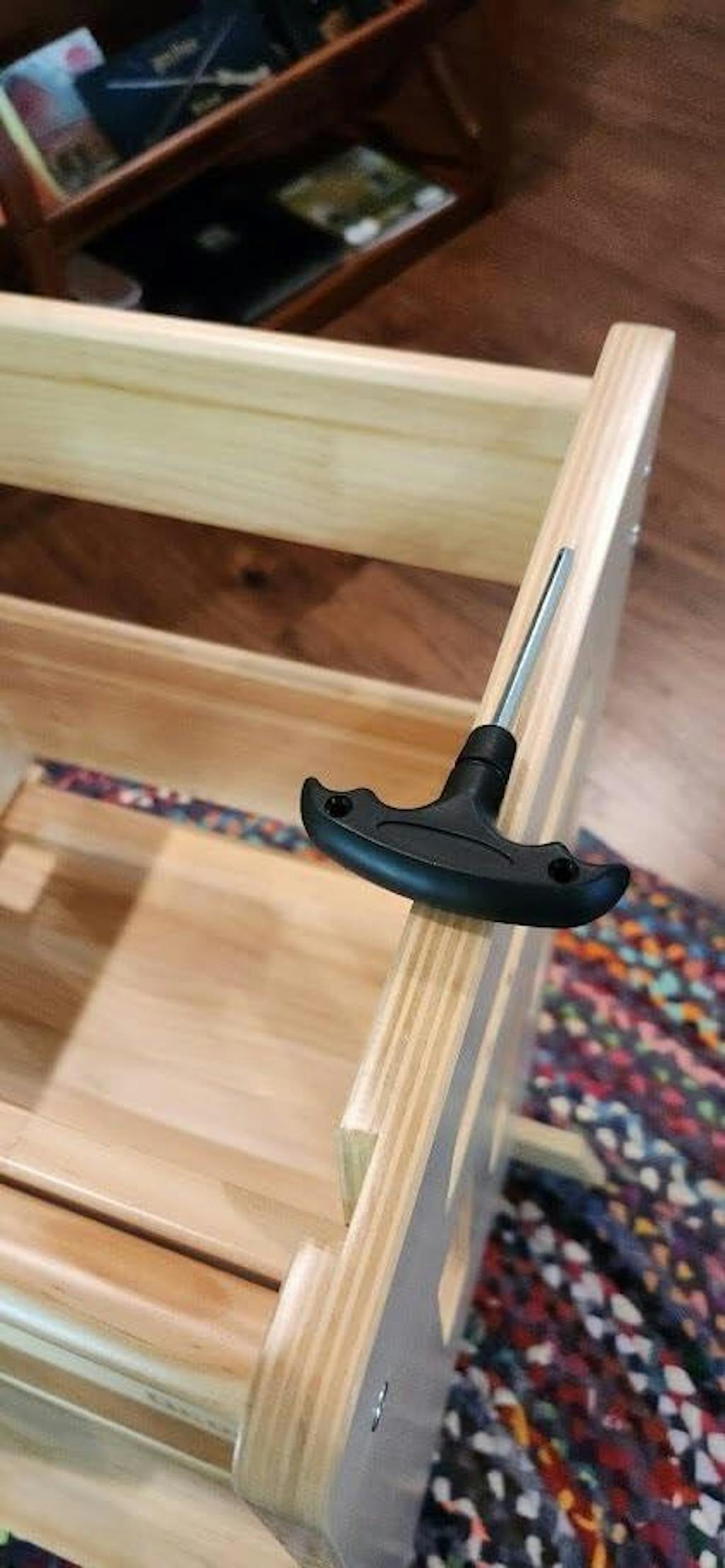 I think this is the nicest learning tower I've seen - the sliding safety panel is great to keep those little ones secure inside without falling through the opening. Assembly was easy with just a few screws on each side, and the included hex key is all you need to put this together.